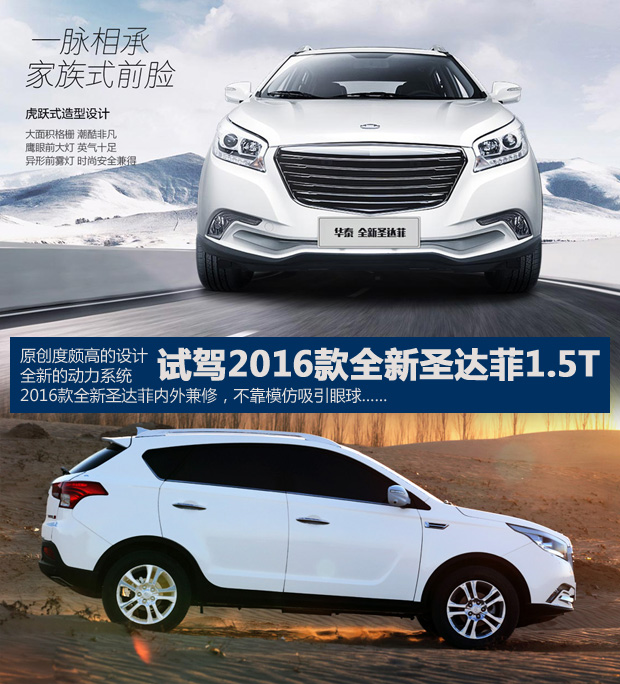 全新圣达菲的内在部分,动力系统匹配良好,日常驾驶轻松、加速表现抢眼;底盘表现是全车最大的亮点,行驶舒适性在同级别车型中绝对是名列前茅;五年15万公里的质保也为它加分不少。目前2016款全新圣达菲官方指导价区间为7.75-9.05万元,原创度颇高的外观和舒适的性能,再加上10万元以内的售价,在自主品牌紧凑型SUV这一细分市场绝对不输同级产品,是一名内外兼修的实力悍将。