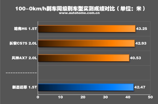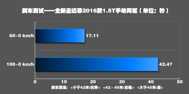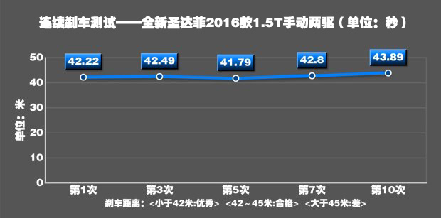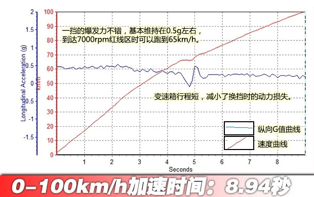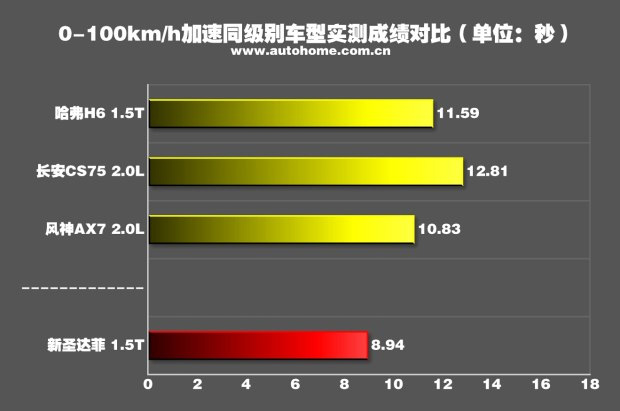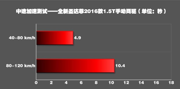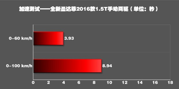 全新圣达菲在起步时可以将转速提升到6500rpm,但是这样会导致前轮疯狂打滑,损失时间。4500rpm是个比较合适的起步转速,轮胎只有轻微打滑,车身姿态很好。一挡的爆发力不错,基本保持在0.5g左右,65km/h升入二挡,此时动力也没有明显衰竭,最终用时8.94秒破百。这个成绩在我们测试过的所有自主品牌SUV中高居第二,与同级别车型相比有着非常明显的优势。