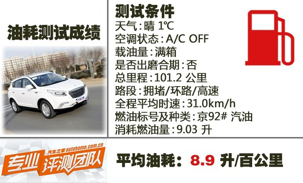 油耗测试当天共行驶了101.2公里,其中拥堵路段占到了百分之四十,平均时速31km/h。全程换挡时机不超过2500rpm,没有激烈驾驶,最后消耗燃油9.03升,测得平均油耗为8.9L/百公里。对于一台还没有出磨合期的新车来说,这样的油耗表现很不错。