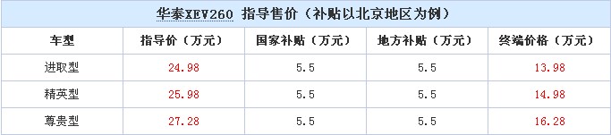 华泰新能源XEV260作为国内首款纯电动SUV,一直备受市场关注和亲睐。XEV260共推出三款车型,进取型、精英型和尊贵型,在北京地区享受国家和地方政策补贴后售价为13.98万~16.28万元。不仅如此,华泰新能源XEV260在今年也被列入免征购置税新能源汽车目录中。在多重优惠下,华泰新能源XEV260受到广大消费者关注,并引爆全场,成为热销产品。
