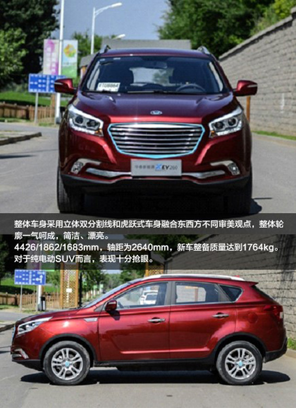 外观方面,新能源XEV260,硬朗的车身外表融入了欧式的设计风格,华泰新能源整车的长宽高分别为4426/1862/1683mm,轴距为2640mm,新车整备质量达到1764kg。对于纯电动SUV而言,表现十分抢眼。