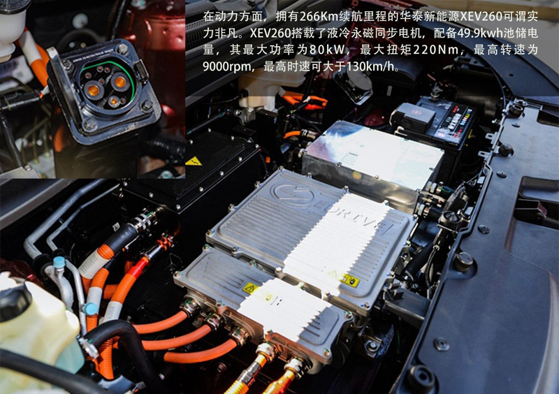 动力方面,拥有266Km续航里程的华泰新能源XEV260可谓实力非凡。XEV260搭载了液冷永磁同步电机,配备49.9kwh池储电量,其最大功率为80kW,最大扭矩220Nm,最高转速为9000rpm,最高时速可大于130km/h。